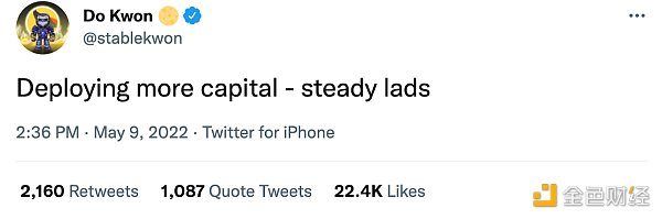 Do Kwon 和 Terra 社区预计,恢复挂钩只是时间问题。许多人认为,支持 LFG 的巨额资本——数十亿美元的 BTC 和 LUNA,加上 Jump Trading、三箭资本等的既得利益,使 Terra 大到不能倒。