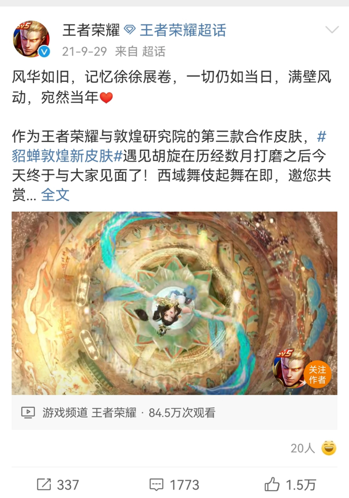同时,和游戏等年轻人喜爱的新娱乐产品联动也成为博物馆方热衷的跨界传播方式。去年,敦煌研究院便与腾讯游戏存在深度合作,《王者荣耀》中的数款英雄皮肤与莫高窟壁画进行了联动。此外,敦煌研究院也与华为手机联合开发更多的虚拟看展、云看展项目。