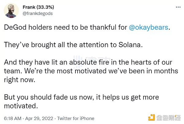 Okay Bears 的爆火出圈,让更多人了解到了 Solana NFT 一样有很强的造富效应。Solana NFT 市值排名第一的项目 DeGods 的创始人 Frank 甚至发推表示感谢:「DeGod 的持有者要对 Okay Bears 表示感激,它们为 Solana 带来了更多的注意力。」