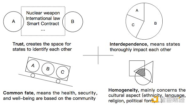 其次我们认为应该“依托 DAO,拓新道”:通过 DAO 这种全新的人类组织形态,补全康德社会所需条件,探索经济行为新范式。在建构主义的理论中,Trust 只是实现康德社会的启用因素。而和谐高效社会的实现还需要依存(Interdependence),**共同命运(Common fate)或者文化同质性(Homogeneity)**这三个积极因素之一在系统中的存在。下图解释了三种因素与 Trust 的定义和现实例子: