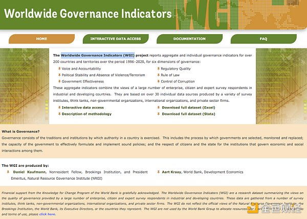那么当把这种计算机辅助的决策思维带入社区治理时,高频交易策略可能并不是最合适的选择。正如中国古文所说“治大国如烹小鲜”,社区往往经受不住反复的治理策略调整。其实用金融的思维来看也很好理解这一点,就是摩擦成本过高,所以在治理中并不能选择高频的策略。那么最后剩下的就只能是利用计算机的辅助,采用“高成功”+“高回报”的制度政策设计方式。进一步梳理 Web3 生态下,人机协同的治理情况后,我们认为上文中的效用U或许可以借鉴传统政治学中的指标 Worldwide Governance Indicators(WGI)来进一步细化。