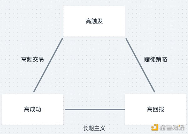高触发指的是,我们依靠计算机辅助系统设计的量化策略总是能满足条件而引发操作。高成功指的是,一旦这个策略得以触发,有高概率能获得正收益。而最后的高回报指的是,这种量化的策略在成功执行后,其带来的无论是经济效益还是社会福祉的回报数量都十分巨大,然而这种回报可能为正,也可能为负。