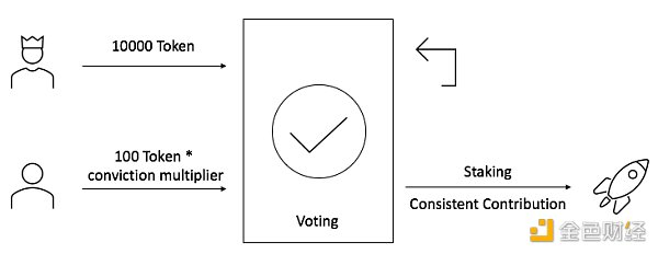 信念乘数是一种将权力分配,向个人用户倾斜的方法。在去中心化系统中,一人一票/一元一票乃至二次方投票法等方式都无法完全避免女巫攻击。信念投票虽然可以一定程度上将参与者为组织所做的贡献体现在投票结果中,但当面对巨鲸的“钞能力”时,个体的力量依然微弱。而信念乘数一定程度上可以遏制这种现象。
