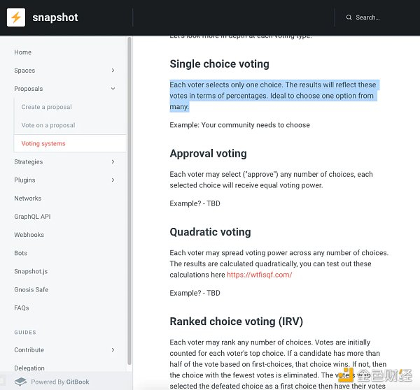 在最广为使用的投票治理平台 Snapshot 上,其为提案准备了以下投票制度: