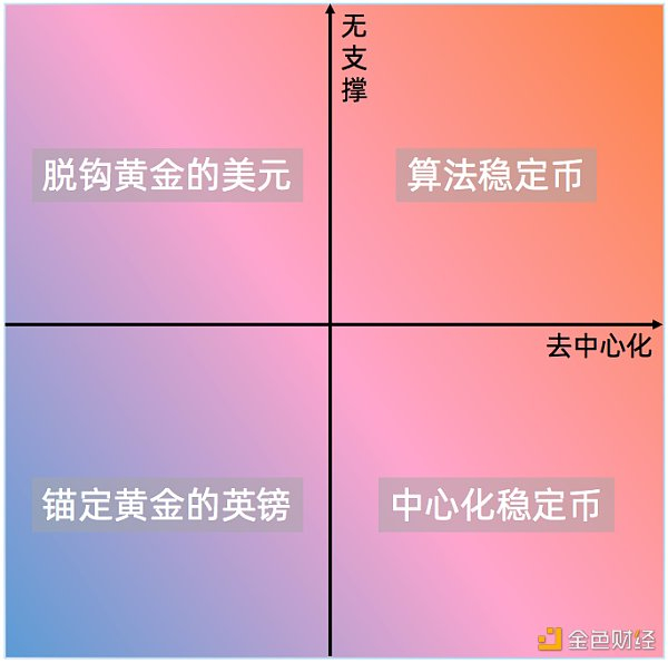 以近期被广泛讨论、颇受争议的稳定币类项目为例。如果简单的把项目的商业模型看做项目背后的价值支撑,用中心化和去中心化作为第二条划分的维度,那么现有的货币体系可以放入下图所示的坐标分类系统中。