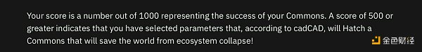 游戏背景设定为世界的生态系统已经崩塌,作为主人公的玩家穿越回到过去,在 cadCAD 帮助下教导社区创建再生,以期拯救世界。在游戏中,玩家需要确定这套新系统的初始状态、社区资金的分配比例、投票速度、退出机制等,最终游戏给出模拟结果,以及是否成功拯救世界的评分,满分 1000 分,高于 500 分判定为拯救成功。