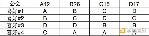 2.排序复选制投票(Instant Runoff Voting):也被称为“顺位同票制”或“优序投票制”。选民在选票上按喜好排列支持的候选项。点票时,首先将最少人排在第一位的候选者排除,重新排列选民的喜好,再将最少人排在第一位的候选者排除,直到剩下两位候选人为止。目前这种投票方式依然是许多主权国家(Eg. 澳大利亚、爱尔兰等)在进行投票时所采用的机制。在这个假设案例中,我们认为每个公会的成员所投票的情况相同,如下图所示: