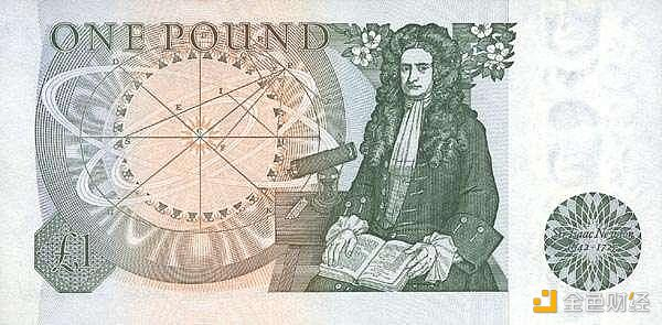 1694 年,为了进行英法战争,英国王室向伦敦 1286 个商人,以股份制计息 8% 的形式借贷了一大笔战争款项。这项贷款促使了英格兰央行的诞生。该银行发行的英镑一开始只是用来记录黄金的单位,于是其价值波动极大,难以广泛使用。于是,时任英国皇家铸币局局长的牛顿,确定1英镑锚定 7.32238 克纯金,以政府法律的形式规定了英镑这种代币背后的价值,并以中心化的形式为这份价值支撑背书。人们不用再携带金币,用英镑就行,于是基于英镑的价值流转网络建立起来。
