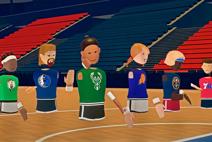 随后我们看到Rec Room的主娱乐中心大厅推出了各种与2022年NBA季后赛相关的全新篮球主题内容,玩家可以穿着自己喜欢的球队球衣完成扣篮动作,并“拍照”留念。