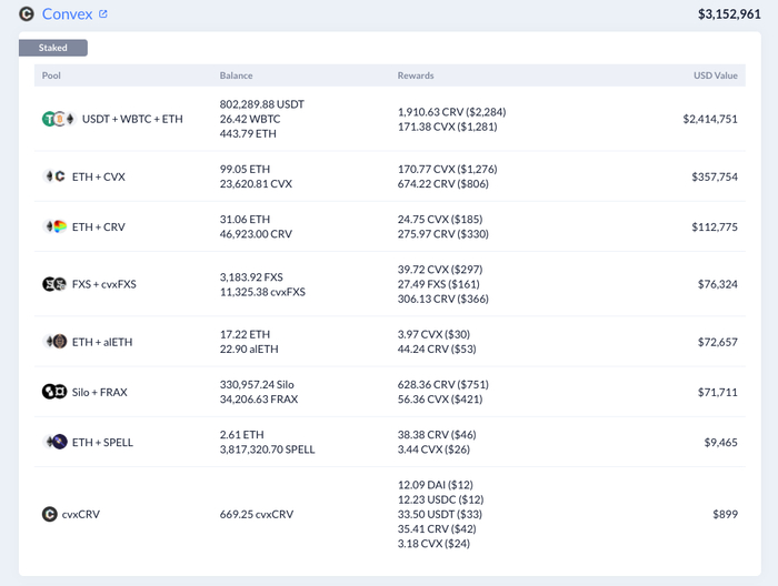 目前Convex上线将近100个池子,除了各种类型的稳定币之外,还有BTC锚定币、ETH以及其他小币等,但是对于巨鲸们来说,更偏好的还是稳定币、主流币的挖矿。