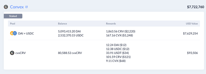 当然,CRV的抵押也不少,毕竟,为了提升在Curve流动性之争中的话语权,Convex使尽各种办法吸引用户抵押CRV。