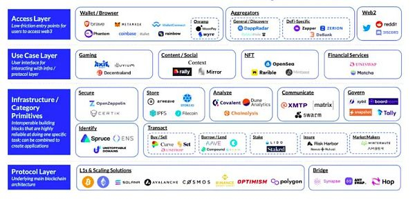 首先,让我们看看Web3的组成。根据Coinbase的分类,Web3大致可以分为4层。协议层、基础设施层、用户用例层、访问层。