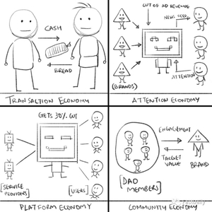 社区经济 —— 社区经济是合作社的演变。我们没有谈论 DAO 的宏观经济背景。互联网让我们有机会进入全球市场(2010 年)。智能合约使我们能够在没有中间人的情况下相互信任(2020 年)。这场疫情提醒我们,我们的时间很短,一个人应该为自己拥有的东西而努力。它告诉我们,一个人可以做所有正确的事情,但仍然会被生活搞垮。所以我们一直处于探索替代经济模式的阶段。这就是 DAO 的作用(你可以说 DAO 相当于 Z 世代的‘占领华尔街’),它们将个人自主权与早期不存在的经济机会联系起来。社区经济是用户管理他们使用的东西的实例。这些经济模式留下了经济互动的链上证据,导致这些经济参与者的数据开放。社区经济与平台经济和注意力经济的不同之处在于,关于参与者的数据通常不会被隔离在公司拥有的服务器上。任何人都可以在此基础上进行查询和建设。Gitcoin、ENS、Covalent、Biconomy 和 LobsterDAO 等基于 NFT 的 DAO 都是这样的例子,股东驱动的公司是一种社区经济吗?