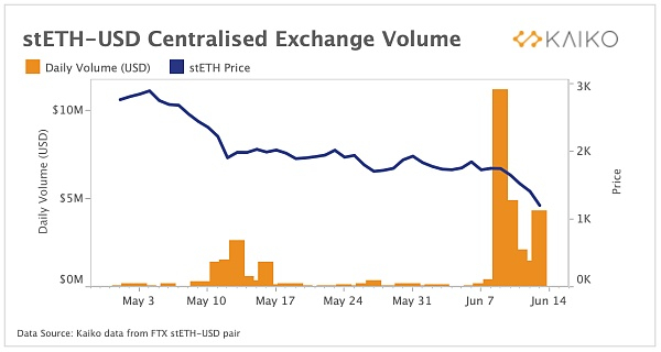 使用 2% 的市场深度作为中心化交易所可用 stETH 流动性的衡量标准,我们在 6 月 11 日之前观察到 FTX 上只有价值 30 万美元的 stETH 流动性。但在 Celisus 的恐惧席卷市场之后,这个数字下降到不到 5 万美元,而 stETH 持有者现在几乎耗尽了他们在中心化交易所可以找到的所有可用的 stETH 流动性。