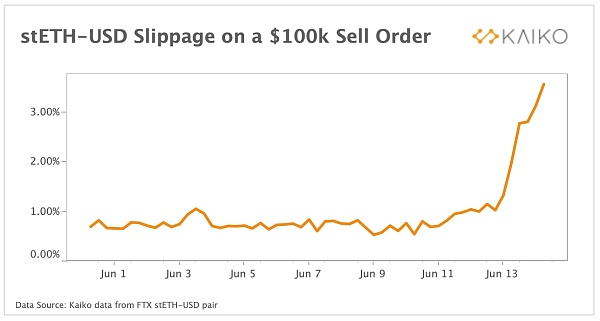 为了说明在 FTX 上仅出售价值 10 万美元的 stETH 会招致的损失,我绘制了交易所中 stETH-USD 对的滑点图,我们可以看到在 FTX 上仅仅出售价值 10 万美元的 stETH 都已经变成完全不可行。该货币对的滑点已增至 3.5%,再加上 stETH 对 ETH 价格的折扣约为 5%,这意味着在中心化交易所出售 stETH 导致 10 万美元的订单损失 8.5%。