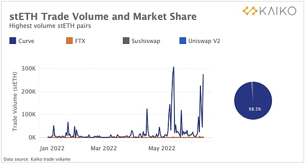 总体而言,stETH 交易活动由 Curve 主导,占 2022 年总交易量的 98.5%。尽管 stETH 也上架了 Uniswap 和 Sushiswap 等其他去中心化交易所,但交易量和流动性远没有那么高。