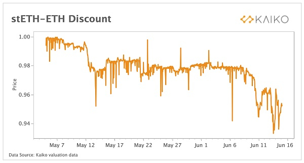然而,Lido/stETH 的迅速崛起以及 Terra 的崩溃导致了 stETH-ETH 汇率出现了一些问题。5 月,stETH 开始以低于 ETH 5% 的价格交易,引发了最初的担忧。上周,这种折扣再次出现,引发了 Celsius 流动性问题的开始。