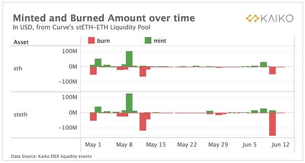 在上周,我们不仅看到了 Celsius 以及加密交易平台 Amber Group 的“绝境求生”,他们都被发现向FTX 发送了大量的 stETH 和其他储备。下图是 Curve stETH-ETH 池中的铸币和销毁,我们观察到上周 stETH 和 ETH 都发生了大量销毁,表明流动性已从 Curve 池中大量撤出。