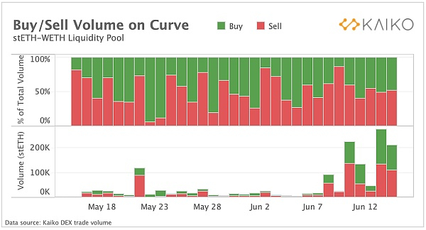 通过观察 Curve 流动性池中的交易量,这里有一些有趣的见解:自 5 月下旬以来,流动性池中 stETH 与 ETH 的相互交换似乎分布相当均匀,这可能表明一些投资者乐于以目前的折扣购买 stETH,以便在可以 1:1 兑换 ETH 时获取利润。出售的 stETH 数量表明,也有很多绝望的卖家愿意接受折扣。尽管以目前的流动性条件已经很难摆脱,但 Celsius 和 3AC 很可能会卖出少量的 stETH 以获取 ETH 用以偿付。