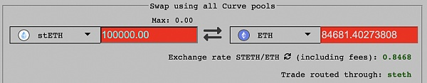 例如,在 Curve 上出售 100,000 个 stETH 换取 ETH 将导致汇率仅为 0.84(这只是 Celisus 持有的总量的 1/4)。