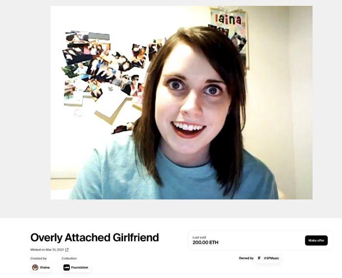 MEMES + CC0 是无需授权就能模仿创作的典型代表。这是一种无形的,但能让大众很好理解的东西,而且非常适合NFT发展壮大。在Kevin meme发展的巅峰时期,这个在常人看来不怎么好看的mf以8.8ETH即26.4万美元的价格被买走。模仿创作会继续存在,不过个人的模仿创作能力却是有限的。