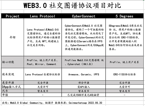 社交图谱赛道中的热门项目包括 CyberConnect, Lens Protocol,5 Degree基本总结如下: