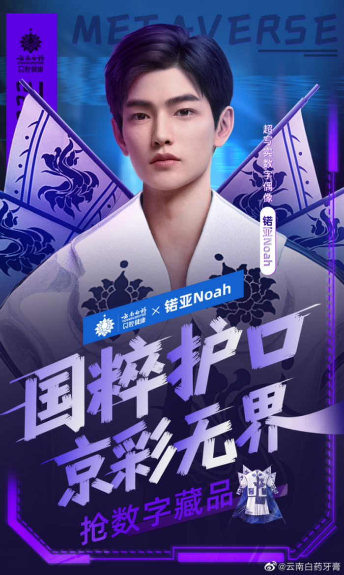 6月5日,#元宇宙服饰也有中国风了#词条登上微博热搜,占据C位的正是云南白药本次参与天猫618元宇宙大秀的数字藏品服饰,该藏品发布时由本次天猫主推的另一位虚拟人锘亚Noah穿戴亮相,与618期间品牌主推的京剧主题牙膏绑定。
