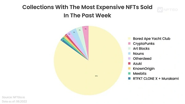 可以看出 BAYC 在 NFT 交易榜中是占比最大的。在过去一周中,超过 85% 的高价交易都来自 BAYC。排在 BAYC 之后的是 CryptoPunks,约占总数的 3%。BAYC 占据主导地位对其自身来说既是看跌也看涨。