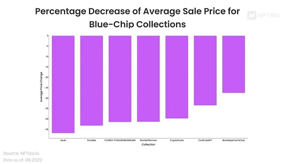 市场情绪变冷极大影响了 NFT 的平均价格。之前在最狂热的阶段,一些蓝筹 NFT 的估值达到最高点。而此后这些估值持续暴跌,陷入了冷却周期。