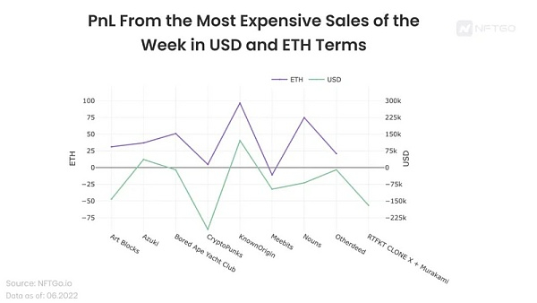 但随之而来的问题是,这些持有者抛售高价蓝筹 NFT 的代价是什么。我们先是研究了过去一周成交价前 200 的交易的平均利润和损失。为了进一步说明 ETH 价格下跌对市场估值的影响,我们又绘制了 ETH 和美元计价的利润和损失表(PnL),计算方法是将卖出价减去买入价。