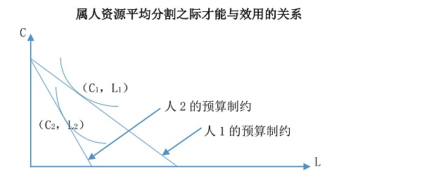 德沃金在理论上主张把才能、身心能力等不可转移的资源也纳入“资源平等”的视野之中。但是,他认为在实践中拍卖方法可以适用于荒岛上的所有资源,却不得适用于劳动力以及才能这种天赋于各人的资源。否则会有“相互奴隶制”之讥,至少容易引起这样的误解。约翰·罗默(Johan E. Roemer)特别注意到德沃金的理论主张,但他认为只要追加一条规则“对于物理上不可分割的资源可以采取权利形式分割”,那么才能、劳动力等属人性质的资源也是可以进行平等分割的。为此,他假设了如下一个最单纯的模型:社会中存在两个人,即具有较低才能s1的人1与具有较高才能s2的人2,si(i=1,2)指人i的劳动(也就是把余暇转用于劳动)每1单位所获得的用玉米产量测算的现物报酬。在这里考虑的财富限于玉米、人1的余暇、人2的余暇这三样。假如最初没有玉米,各人只有1单位的余暇,两人同一L用时间来测算是同样的,且只能消费自己的余暇,所以具有对称的选择偏好u(C,L)。据此,最初赋予社会的全部余暇的价值用玉米来测算就是(s1×1)+(s2×1),即每人有一半的权利。在这种状况设定下,满足哪些条件(包括预算制约)才能达成竞争均衡,罗默作了具体的数学逻辑推理,并把这些分析进一步转换成为资源的纯粹交换模型(如图所示),这里不必逐一具体复述。只是需要注意,纯粹交换模型显示的结果正如中国俗语“能者多劳”表述的那样,有才能的人其享有的福利反倒偏低,尤其在保险机制中处于不利地位;才能的平等化举措只会改善缺乏才能者的福利。