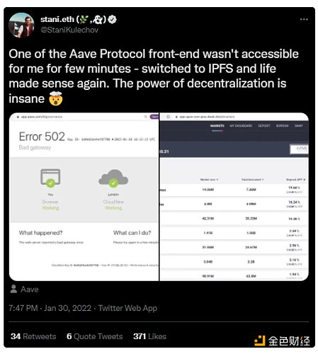 图 7:Aave 创始人 Stani Kulechov 在推特上表示,Aave dApp 前端于 2022 年 1 月 20 日下线,但仍可通过 IPFS 托管的网站副本访问