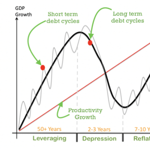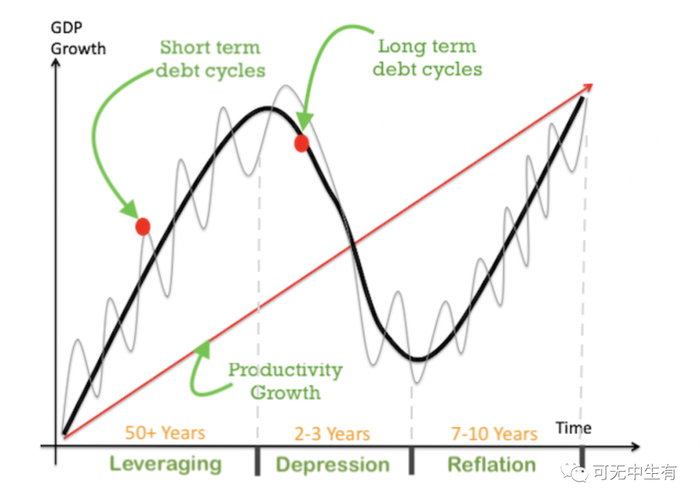 短期央行可以通过利率来控制市面上的钱,可利率对长期的经济就不怎么起作用了。当每一个短期信贷周期的经济增长和债务增长都超过前一个周期,信贷条件越来越宽松,尽管借很多债务,但收入和资产价格上升(借钱投资导致)使得借款人保持很好的信用。可当偿债成本增加速度超过收入增加速度时,信用开始降低,大量的违约开始出现,金融危机产生,这时财政手段开始干预,用税收进行财富再分配,导致贫富差距进一步增加。