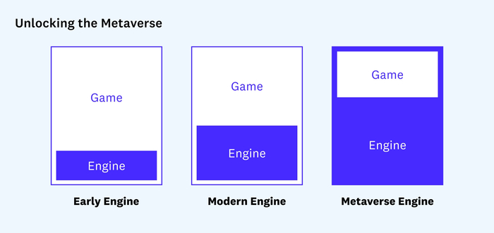 然而,在考虑元宇宙时,引擎扮演着更重要的角色。为了打破将一款游戏或体验与另一款游戏或体验隔开的墙,游戏可能会被封装并托管在引擎中,而不是相反。在这个扩展的视图中,引擎变成了平台,这些引擎之间的通信将在很大程度上定义我所认为的共享元宇宙。