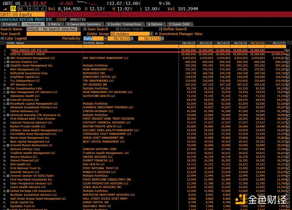 6 月 18 日,彭博终端一度将 3AC 的 GBTC 持仓清空为 0,彭博社给出的理由是, 21 年 1 月 4 日以来,3AC 没有提交 13G/A 文件,他们找不到任何确认三个箭头仍然持有 $GBTC 的数据,并将其作为陈旧数据删除。