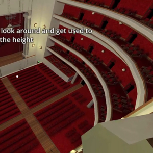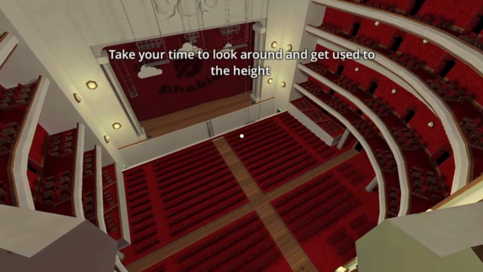 “花点时间环顾一下四周,适应一下新的高度,”这是一条提醒VR用户的提示文本,因为该用户进入了一个模拟在高层剧院阳台边缘的场景。