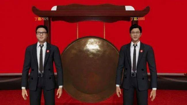 2021年12月,网易云音乐的上市仪式上,除了在线下敲锣的丁磊本人,还有两个虚拟数字人“丁磊”,他们分别被刻画成了2000年29岁的丁磊和2021年50岁的丁磊,三个丁磊共同敲钟。