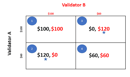 请注意,在上述两种情况下,将利润设置为 60 美元而不是 100 美元是验证者 A 的主导策略。验证者 A 将利润设置为 100 美元从来都不是最佳响应。