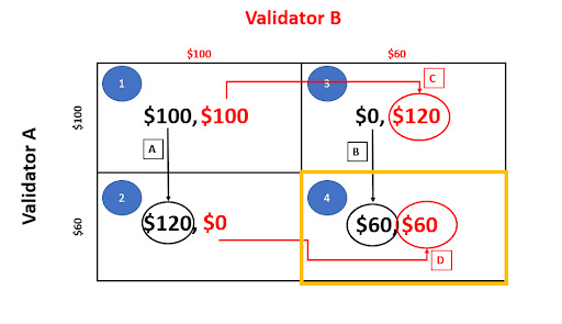 纳什均衡:对于验证者 A 和验证者 B,只有一个潜在结果是两个验证者都做出了最佳响应,那就是如果两个验证者都将利润设置为 60 美元(上图中的黄色框)。这将是唯一的纳什均衡,他们每人将获得 60 美元的总利润。
