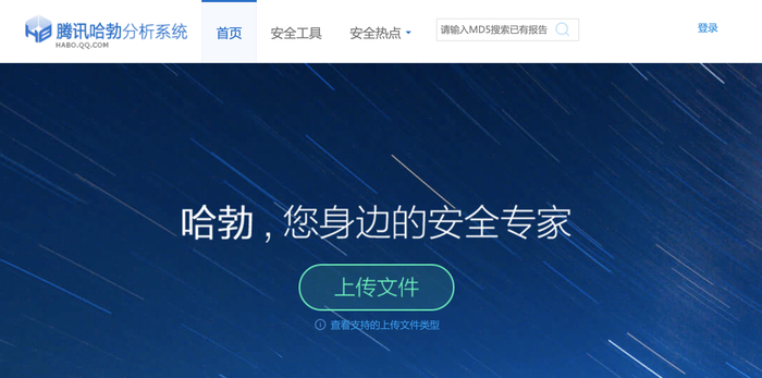 腾讯哈勃分析系统,点击“上传文件”按钮,即可评判文件的安全性,分析文件是否携带病毒;
