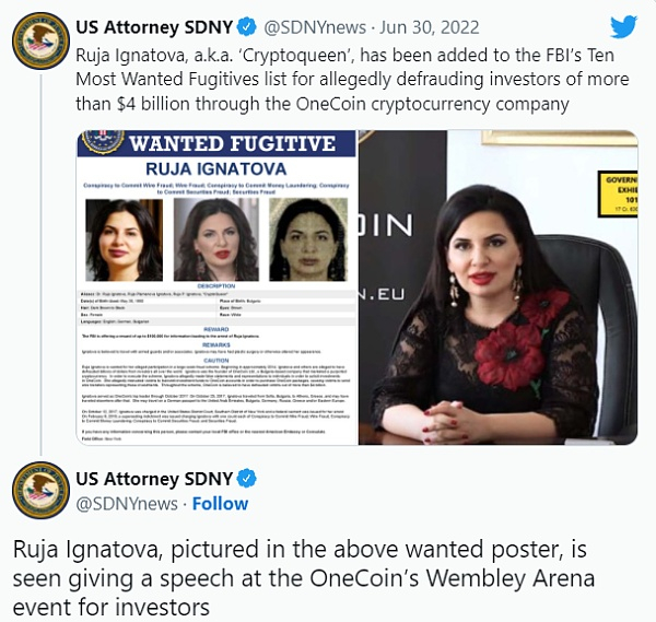 曾被称为“加密货币女王”的鲁亚·伊格纳托娃(Ruja Ignatova)本周四被美国FBI列入十大通缉逃犯名单,她是历史上第11位被列入该名单的女性,也是现在该名单内的唯一女性。