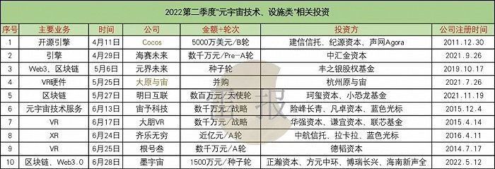 技术、元宇宙基础设施领域,二季度获投金额最高的公司为Cocos(厦门雅基软件有限公司),于4月获得建信信托、纪源资本、声网Agora5000万美元B轮投资,该公司成立于2011年底,2017、2018年也获得了投资,其中2018年获得景林投资、Elevation Capital、西藏一粟创投等的1.2亿美元A轮投资。