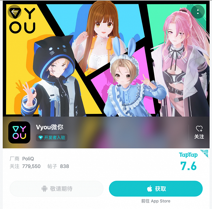波粒子是一家专注于二次元虚拟社交世界的科技公司,核心技术是一套二次元虚拟人物形象自定义系统,以及虚拟人物脸部与身体动作驱动系统。值得一提的是,2020年11月,该公司推出了一款名为“Vyou微你”的二次元虚拟社交应用。APP上线还未到一年,用户量就已超过百万,数据最好的时候,相关榜单上,其排在热门游戏摩尔庄园后面,位列第二。但由于运营不当,此后状态低迷,并已于今年3月发布公告,宣布停止运营。