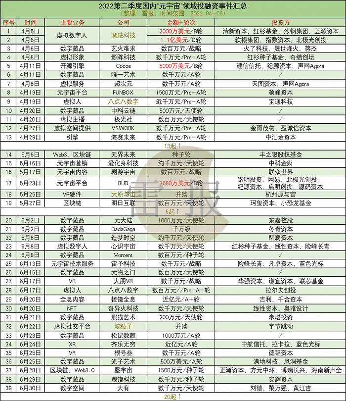 原标题:《2022 Q2:“元宇宙”领域,37家公司获投,有公司拿了8个多亿 | 雷报》
