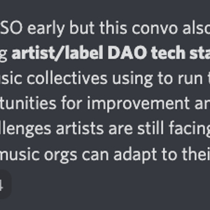 Houndtrack 是 W&M 社区的一名艺术家,他是几个新兴的音乐类 DAO 的成员,包括 hedsDAO 和 LNRZ ,他告诉我们,在他加入这些社区的时候,他‘不知道 DAO 是什么,只知道它是一群人, DAO 是什么的技术性对他来说并不重要’。相反,他的主要动机是直接向探索 Web3 的音乐同行学习;迄今为止,这种学习基本是在 Discord 中进行的,没有任何正式的治理结构来承载这一切。