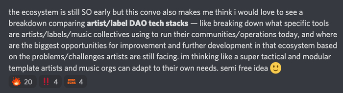 我们在 Discord 服务器中建立了一个研究项目,用于艺术家 / 厂牌类 DAO 技术栈的探讨,该项目建立在我们第 1 季关于 面向艺术家的音乐 / Web3 工具现状 的研究之上。在咨询了社区后,我们得出结论:由于 DAO 赛道的快速发展,每周一次的系列采访比两个月内的单一长篇报告更有价值,更能捕捉到音乐类 DAO 的动态。(这种形式与我们在 第 1 季回顾文章 中提出的想法一致。为了提高人们对我们研究的认识,我们采用了一种更快迭代的出版节奏)。