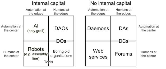 图片标题:Vitalik Buterin 对所有组织的 分类,依据是其内部资本、自动化程度和‘以人为本’。
