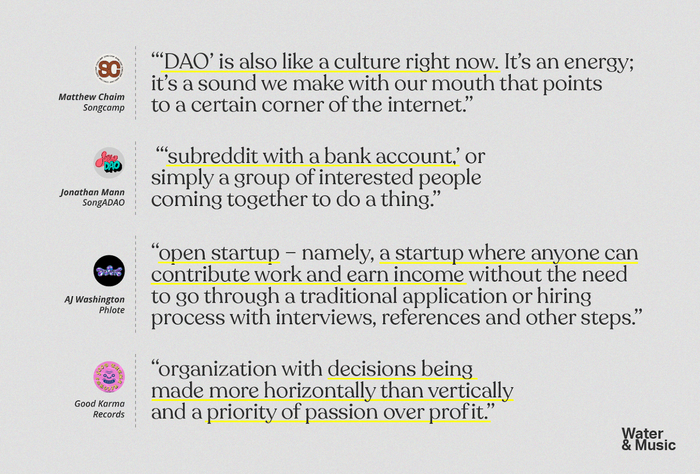 如前文所述,音乐类 DAO 对自己的概念化方式,与更注重技术的加密社区的方式明显不同,虽然是后者的早期工作使我们走到了今天。