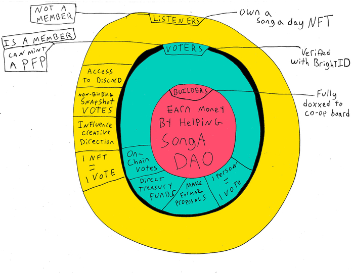 例如, Jonathan Mann 的 SongADAO 在他们的社区中有多个会员级别,被动的金融支持者和主动的 DAO 贡献者之间有明确的划分(见下图)。任何创世的 Song A Day NFT 所有者都可以进入该 DAO 的专有 Discord 服务器,也可以参与无约束力的 Snapshot 投票,但需要用 Bright ID 验证他们的身份,这样他们才能获得关于金库资金的链上投票权。成为 DAO 核心贡献者的另一种方式是作为‘建设者’参与,帮助提高 SongADAO 的价值(例如,通过推动电影或电视节目使用 Song A Day 的歌曲,翻唱或重制一首作品也行)。这些建设者以 ETH 而非 NFT 或社交通证作为补偿,以避免未来治理权力的不平衡。