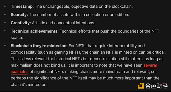 我并不是这个类别的专家。不过,数据科学家和 NFT 历史学家 Chainleft 是这个话题的权威,他最近写了一篇题为‘在历史背景下定义 NFT’的有见地的文章,在文章的最后,Chainleft 强调了五个基本因素,人们在分析那些‘记录历史’的 NFT 的可收集性时会重点关注的一系列元素,分别是‘时间戳’、‘稀缺性’、‘创造性’、‘技术成就本身’以及‘基于哪个链铸造’。